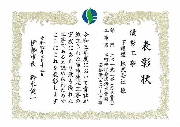 の2部門の工事で、伊勢市より表彰されました。